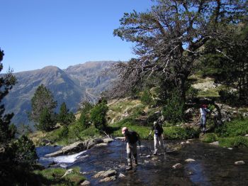 Pasa poco tiempo desde la separación cuando comienza a llover copiosamente. Los que descienden continúan sin parar; los que ascienden paran varias veces para ver si el tiempo mejora pero, finalmente, deciden regresar por el mismo sitio. El descenso se hace largo y complicado, la lluvia ha mojado las rocas que están muy resbaladizas, los torrentes llevan más agua y ha cambiado el aspecto del paisaje.