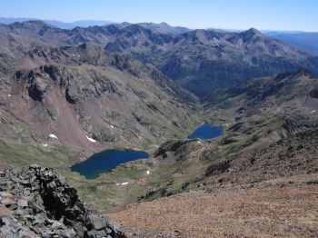 El descenso del Montcalm se hace por la misma senda de ascenso hasta el Coll de Riufred. Desde allí se continua el descenso por el barranco que al oeste desciende hacia los ibones de Cometa d´Estats pero, antes de llegar a ellos, se comienza a remontar al sur la vaguada que desciende del Port de Sotllo. La ausencia de nieve obliga a descender mucho hacia los ibones al ser impractiable la ladera rocosa septentrional del pico Verdaguer (por la que se podría transitar cómodamente con un manto de nieve, perdiendo así mucha menos altura).