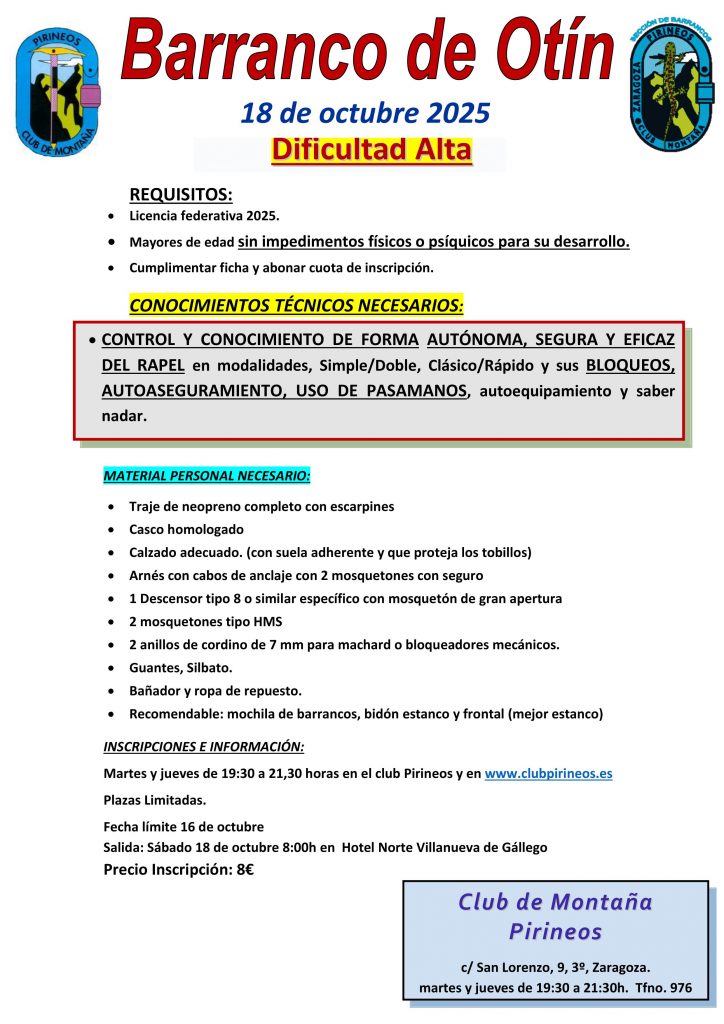 Inscripciones e información: Martes y jueves de 19:30 a 21:30 horas en el club Pirineos. c/san Lorenzo 9, 3º, Zaragoza. Telef: 976298787
