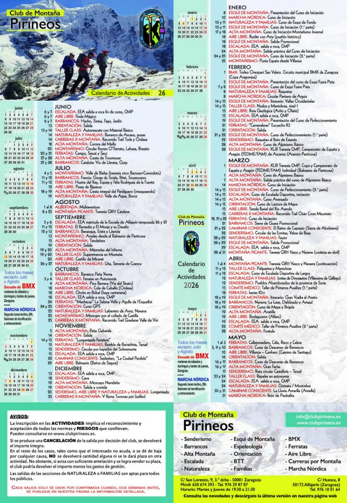 Contiene salidas para las que falta mucho tiempo. Además, las circunstancias, especialmente las meteorológicas, pueden obligar a realizar cambios. Es una declaración de intenciones, no una obligación contractual. Normalmente logramos un grado de cumplimiento superior al 95%. También pueden surgir actividades nuevas. Por todo ello es aconsejable consultar las novedades en nuestra página. Unas dos semanas antes de cada salida se publicará la información detallada de la misma y se abrirá el período de inscripción para socios.
