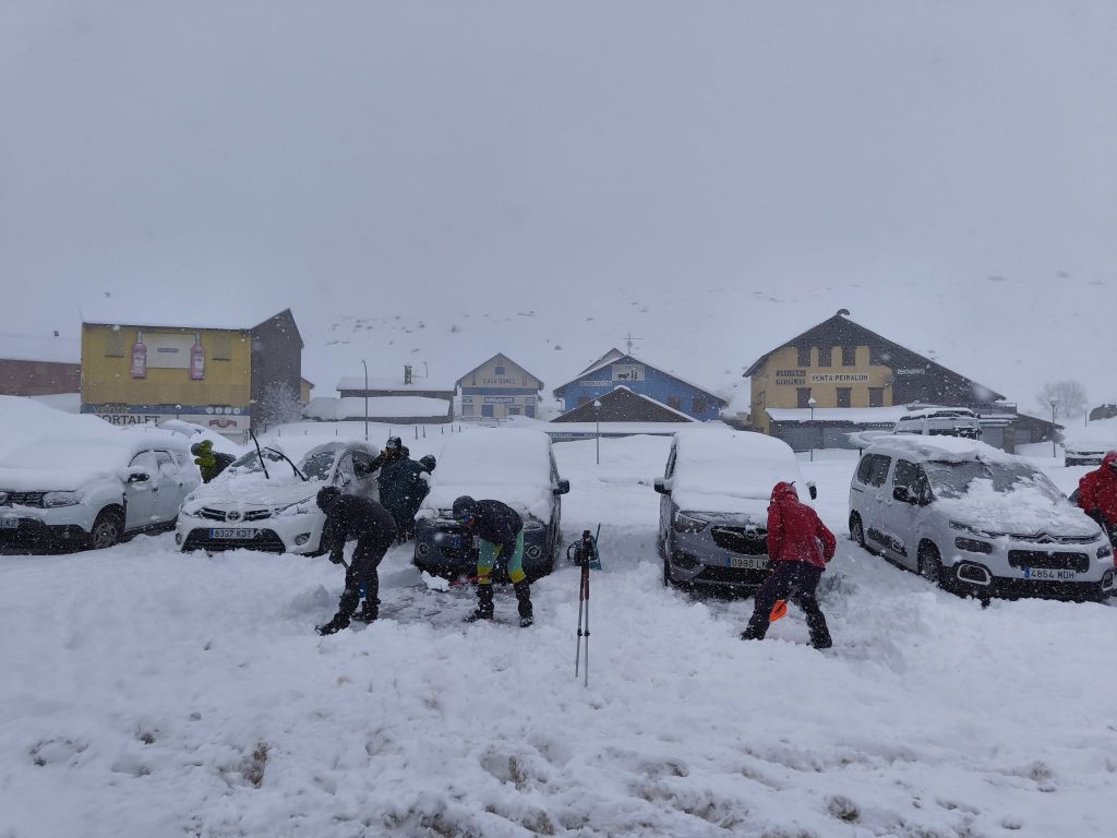 El sábado 17 de enero, a las tres y media de la tarde, apenas un puñado de coches permanecían en el aparcamiento del Portalet bajo uno o dos palmos de nieve… y sí, ahí estábamos nosotros pala en mano, intentando abrir camino hacia la carretera.