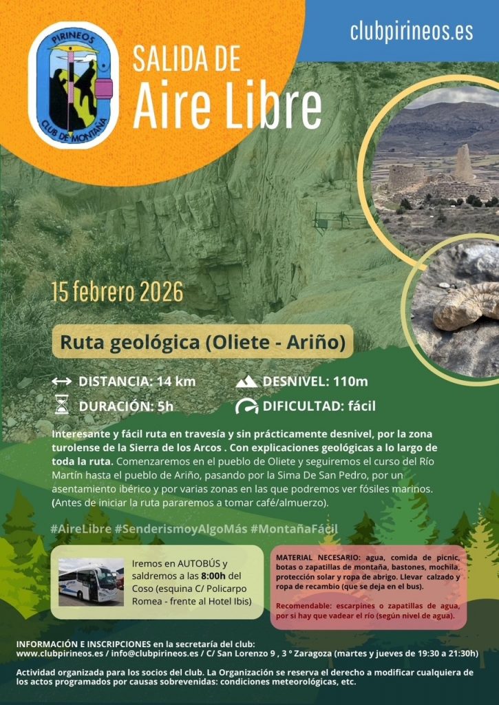 Interesante y fácil ruta en travesía y sin prácticamente desnivel, por la zona turolense de la Sierra de los Arcos. Con explicaciones geológicas a lo largo de toda la ruta. Comenzaremos en el pueblo de Oliete y seguiremos el curso del Río Martín hasta el pueblo de Ariño, pasando por la Sima De San Pedro, por un asentamiento ibérico y por varias zonas en las que podremos ver fósiles marinos.