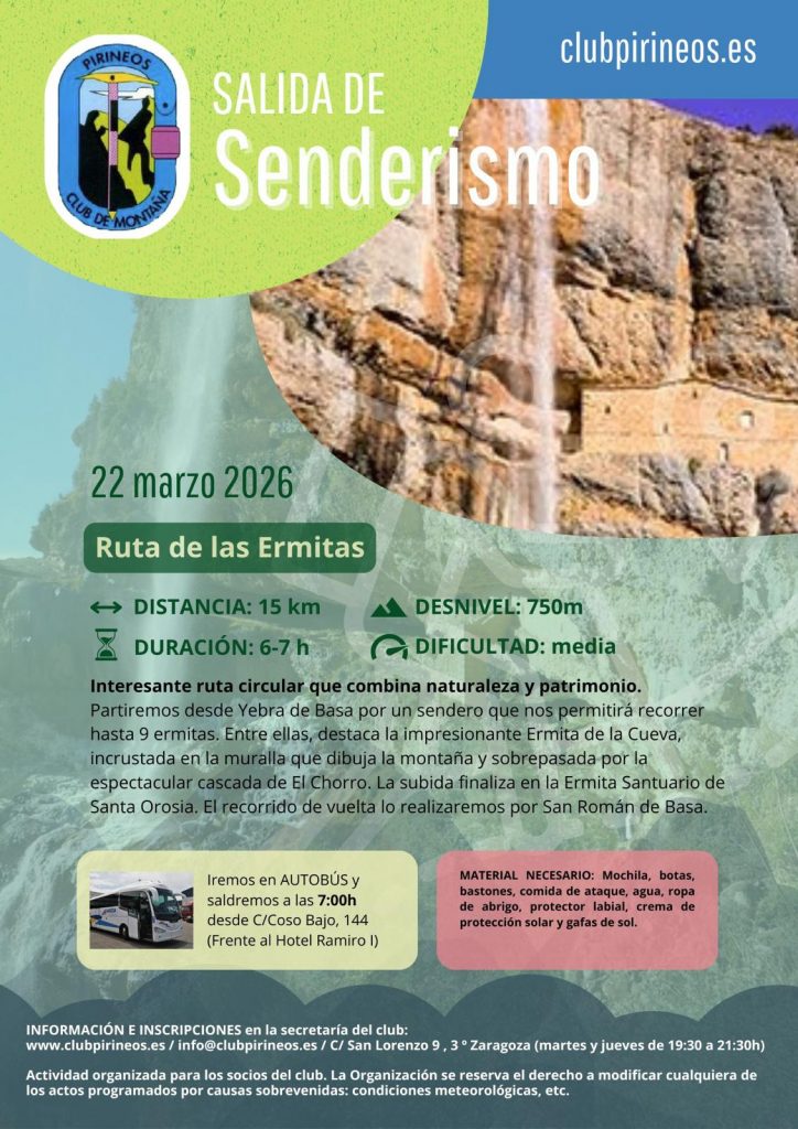 Partiremos desde Yebra de Basa por un sendero que nos permitirá recorrer hasta 9 ermitas. Entre ellas, destaca la impresionante Ermita de la Cueva, incrustada en la muralla que dibuja la montaña y sobrepasada por la espectacular cascada de El Chorro. La subida finaliza en la Ermita Santuario de Santa Orosia. El recorrido de vuelta lo realizaremos por San Román de Basa.