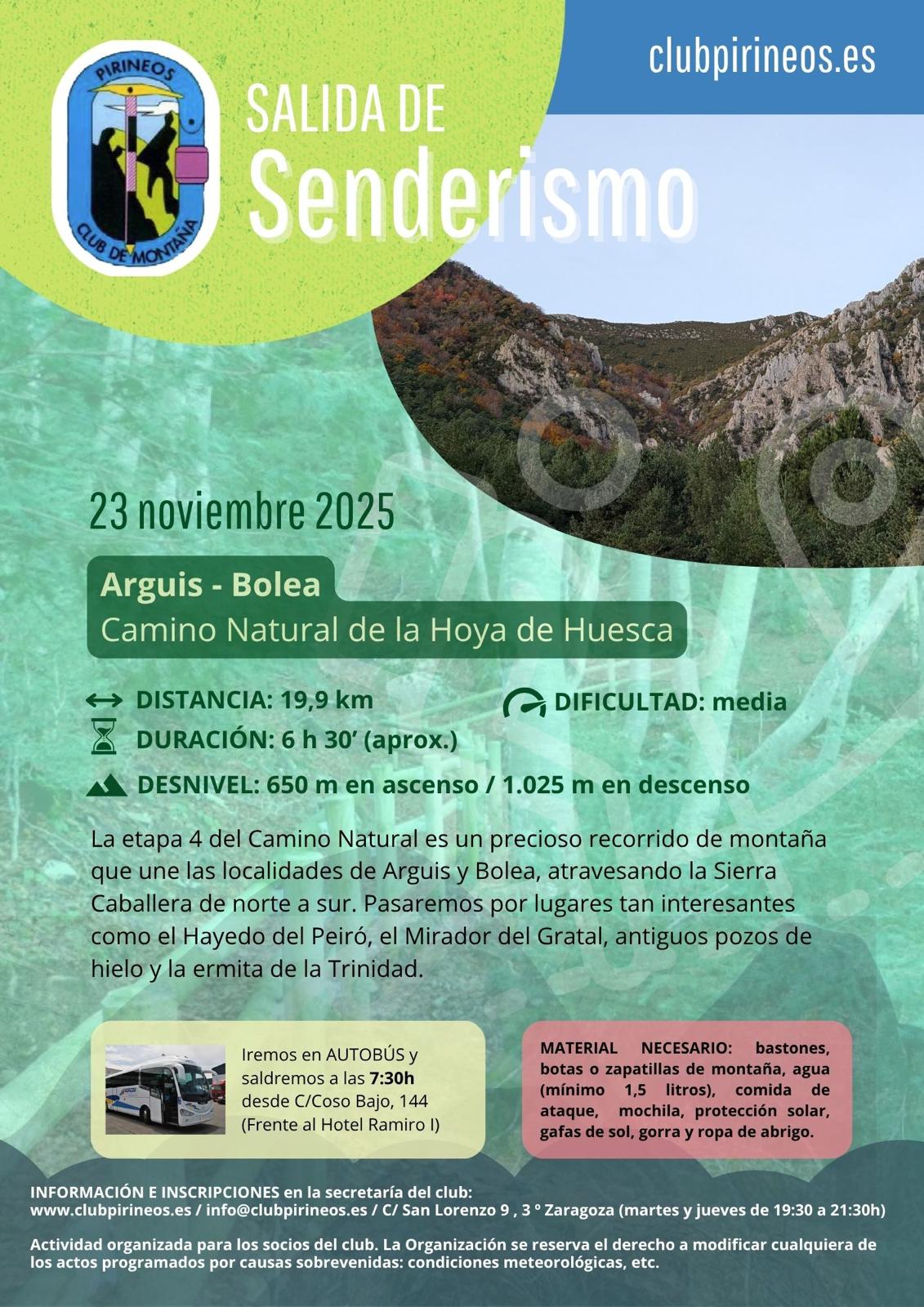 Promocional de la sección de senderismo el día 23 de noviembre. Distancia: 19.9 km Desnivel: 650m en ascenso, 1025m en descenso Duración: 6h 50´ Dificultad: Media La etapa 4 del Camino Natural es un precioso recorrido de montaña que une las localidades de Arguis y Bolea, atravesando la Sierra